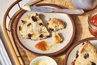 Scones are a centuries-old tradition in Great Britain, where they've been enjoyed in one form or another since at least the 1500s. England, Scotland, Ireland, and Wales all have their own versions of this simple breakfast and teatime treat, which has evolved from a very plain mixture of barley or oats and water cooked on a griddle to its current much more elegant baked incarnation. The modern British scone (pronounced "sgonn," rhymes with gone) is made with white flour, sugar, a leavener, butter, and milk. Similar to American biscuits (though less rich), it's classically served with raspberry or strawberry jam and thickened cream (Clotted Cream or Double Devon Cream).